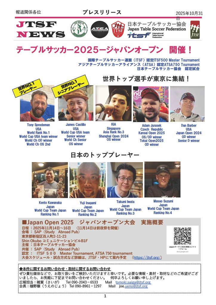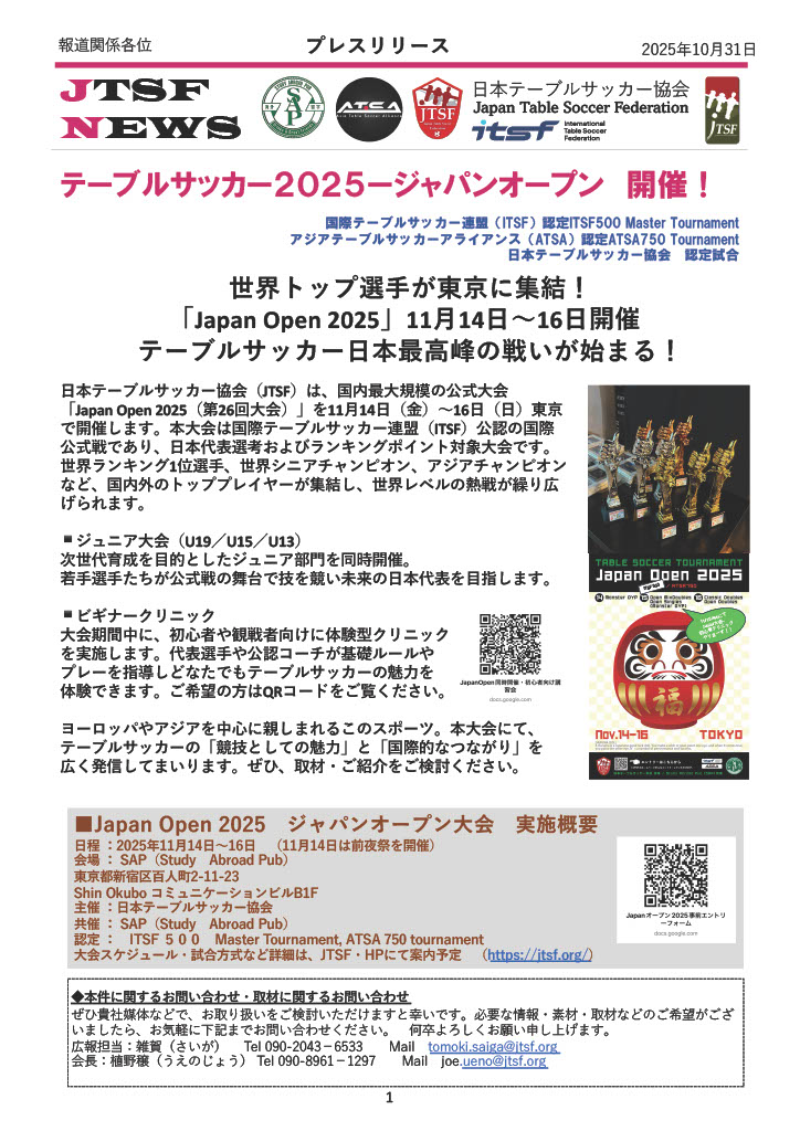 11/14-16のジャパンオープン開催にあたり、下記のとおり報道・メディアへのプレスリリースを配信いたしました。